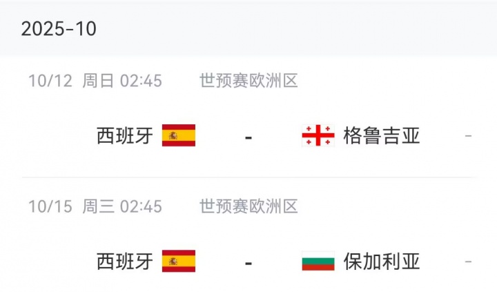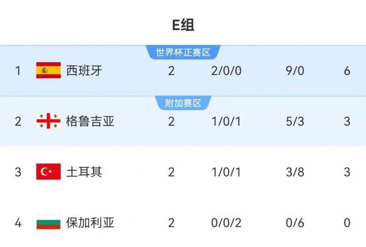 西班牙本月将进行两场世初赛欧洲区比赛:10月12日主场迎战格鲁吉亚,10月15日迎战保加利亚。现在西班牙活着初赛欧洲区E组2战全胜名挨次1。