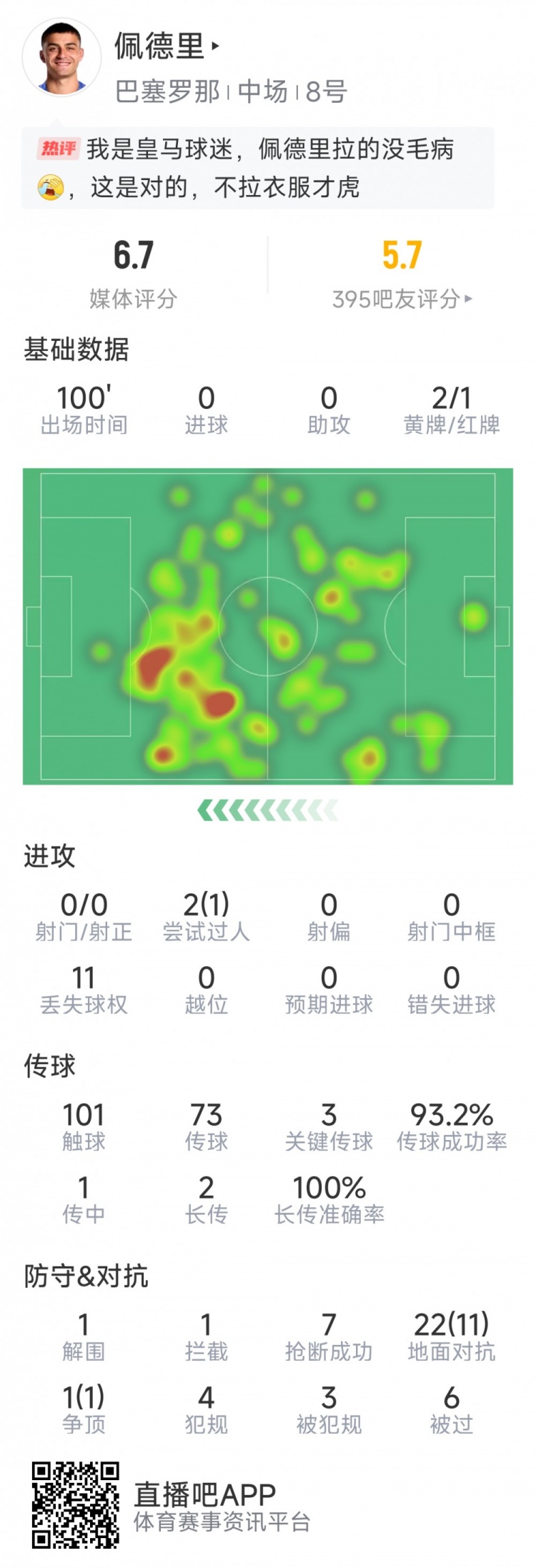 佩德里本场数据:3次要道传球,7次抢断,终末本事两黄被罚下