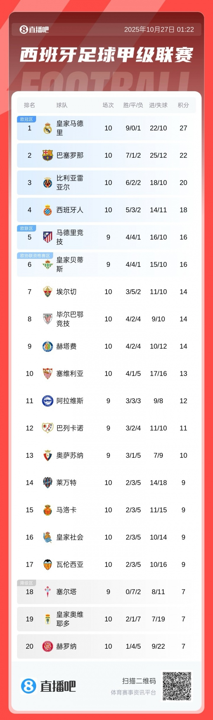 主场复仇!西甲积分榜:皇马5分上风领跑,巴萨第2,西班经纪东谈主第4