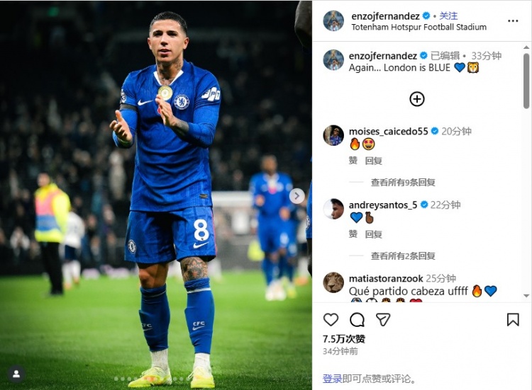 恩佐上传了我方在比赛中的相片,并配文写谈:“再一次……伦敦是蓝色的💙🦁”。