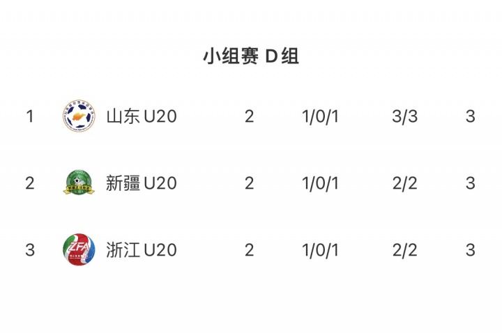 昨日男足U20的D组末轮较量鸿沟后,山东、浙江、新疆三队同积3分,山东U20队凭借进球数上风(3球)领先出线。