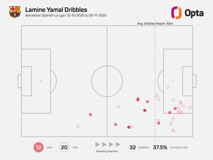 Opta指出,10月12日以来,亚马尔联赛尝试过东谈主32次,与图卢兹球员博霍比肩五大联赛最多,过东谈主奏着力37.5%。