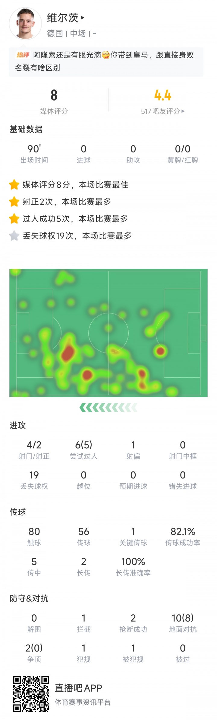 维尔茨此役80次触球19次丢球权,6次过东谈主5告捷,4射2正。他在防范端还有1次禁锢2次抢断,10次大地抵抗8告捷,2次争顶失败。球员的机构评分8分,是全场最高的球员,比梅开二度的队友沃尔特马德还高。