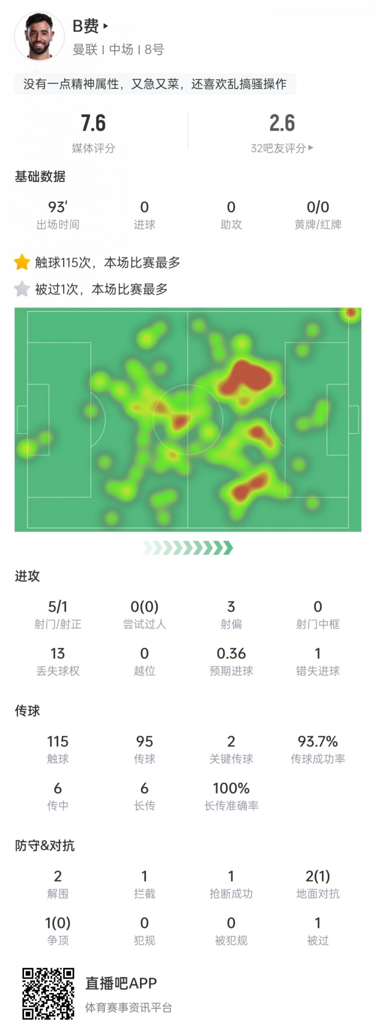 B费本场数据:触球115次全场最多,6次长传沿途得胜,获评7.6分