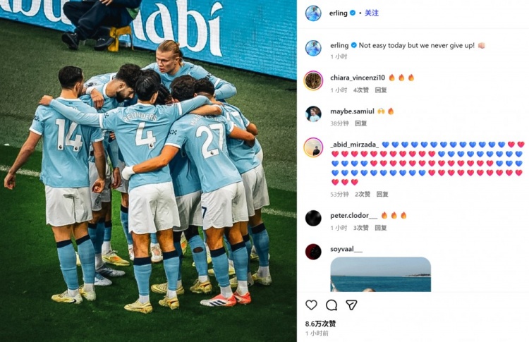 哈兰德也在赛后通过社媒晒出全队相拥庆祝照,并配文:“今天并破裂易,但咱们从不肃清!”