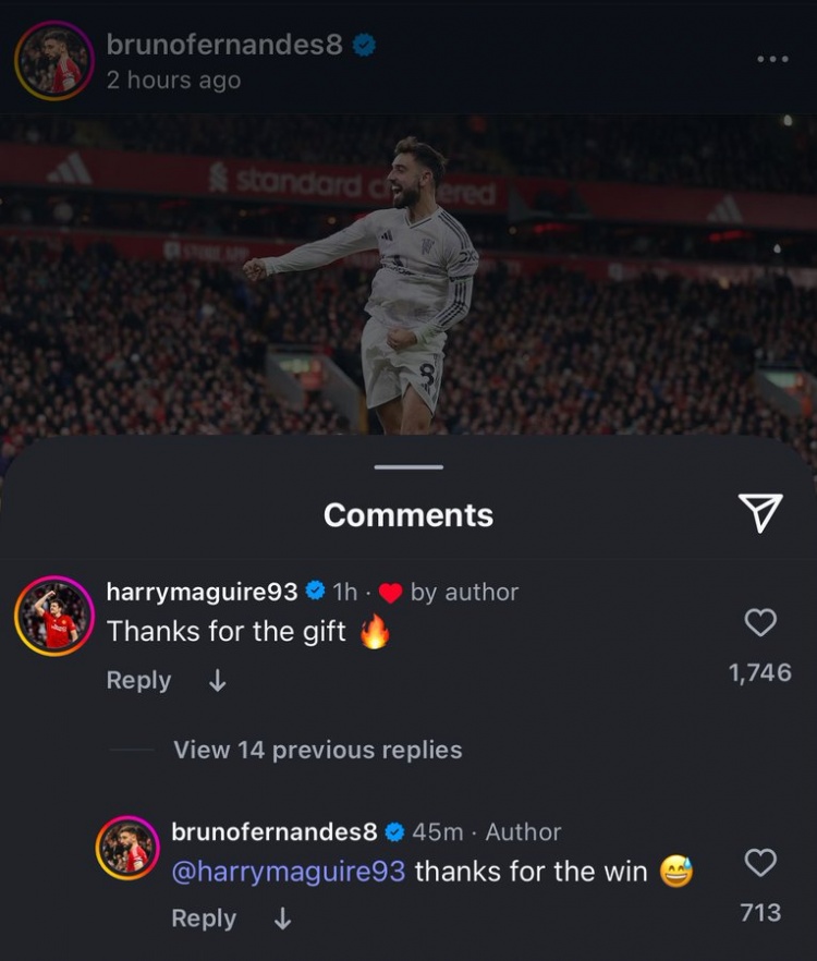 B费赛后社媒晒照庆祝得手,马奎尔留言:“谢谢你的礼物。”