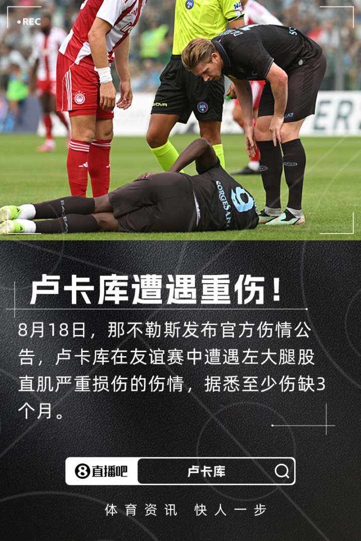 在那不勒斯对阵奥林匹亚科斯的季前热身赛中,卢卡库射门时拉伤我方的左大腿股直肌。从8月15日受伤之后,直到当今还未复出。