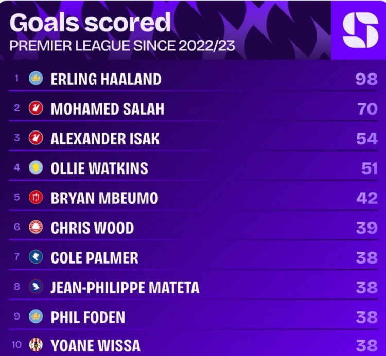 22-23赛季以来英超弓手榜:哈兰德98球断层居首,萨拉赫70球次席