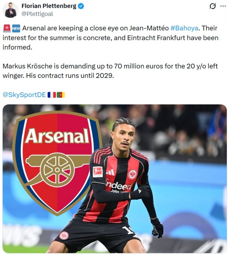 12月3日讯 据德天外记者Florian Plettenberg报说念,阿森纳正在密切眷注法兰克福边锋巴霍亚。