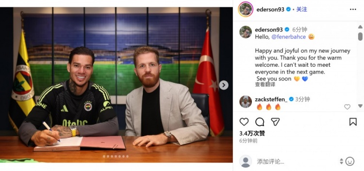 9月2日讯 埃德森精采加盟费内巴切,球员在社媒晒出签约照,并抒发了快活之情。