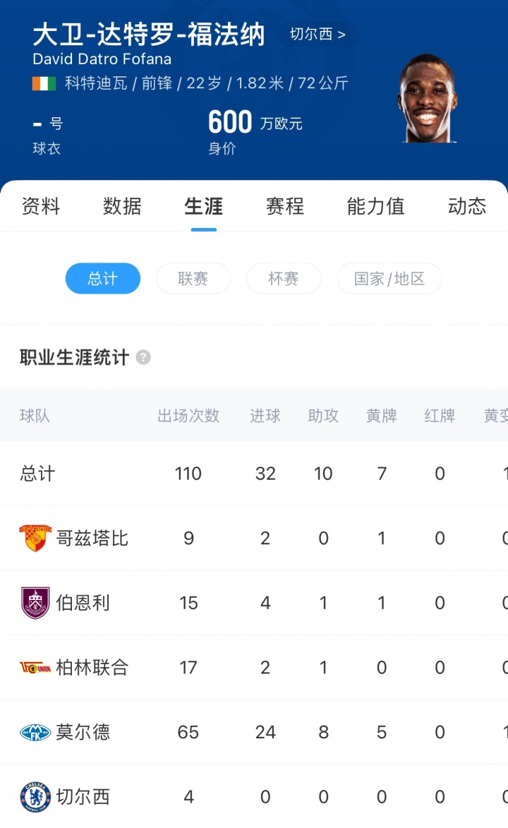这位科特迪瓦球员上赛季前半程曾租出服从于哥兹塔比,其奇迹活命始于2020-2021赛季的莫尔德俱乐部。在莫尔德65场比赛中攻入24球的福法纳,于2022-2023赛季转会至英超劲旅切尔西。这名弓手还曾租出服从于柏林逢迎和伯恩利俱乐部。
