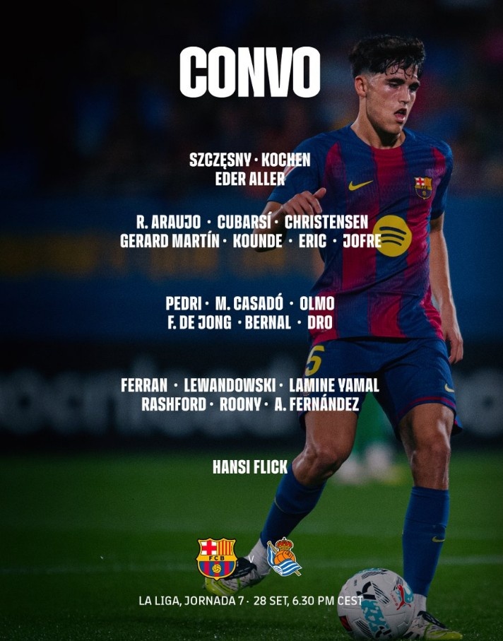 9月28日讯 巴萨本轮西甲将迎战皇家社会,球队官方也公布了本场球队大名单,亚马尔讲究,拉菲尼亚、门将霍安-加西亚缺席。具体如下: