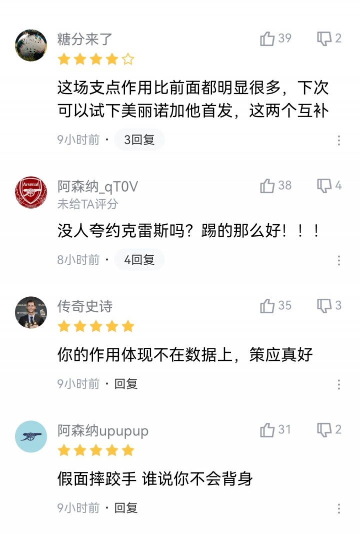 昨晚英超第6轮,阿森纳2-1绝杀纽卡,约克雷斯本场比赛首发打满全场,数据上并不出彩,媒体评分也仅有5.8分。但球迷为他打出了8分的高分,确定了约克雷斯在场上的支点作用。