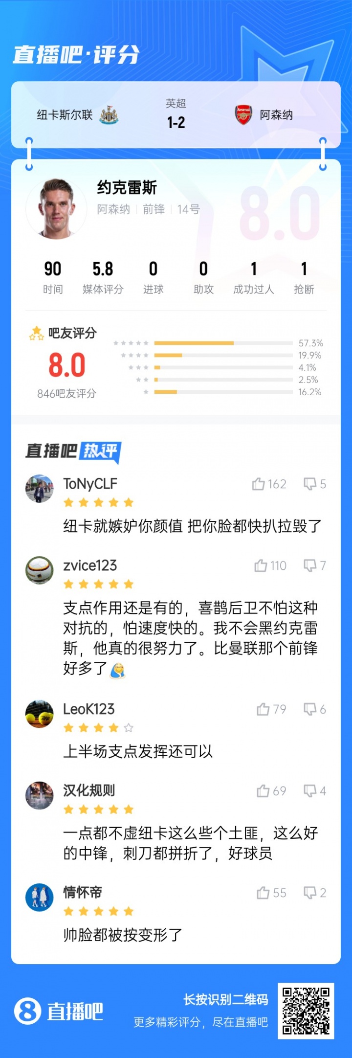 纽卡忌妒你的颜值😂约克雷斯0球0助球迷评8分:支点作用较着
