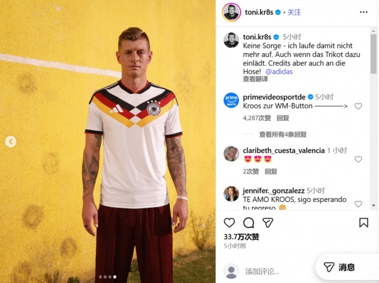在应答媒体上,克罗斯晒出了我方身披德国2026年寰宇杯球衣像片,并写谈:不消顾忌,我再也不会穿戴它奔波了,尽管这件球衣如实很诱东谈主。趁机说一句,这件球裤也可以。