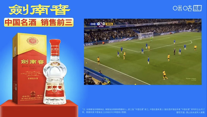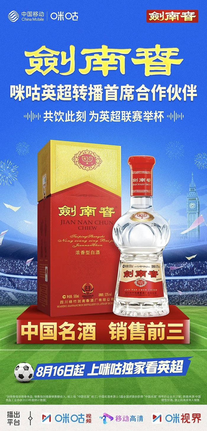 如今,剑南春与咪咕达成深度策略配合,成为咪咕英超转播首席配结伙伴。这不仅是两大品牌在体育营销上的强强聚拢,更是中国品牌与宇宙顶级赛事IP的两边奔赴,深度整合英超顶级赛事资源,联袂亿万球迷分享顶级足球盛宴,点火白酒跨界体育营销的新激越。