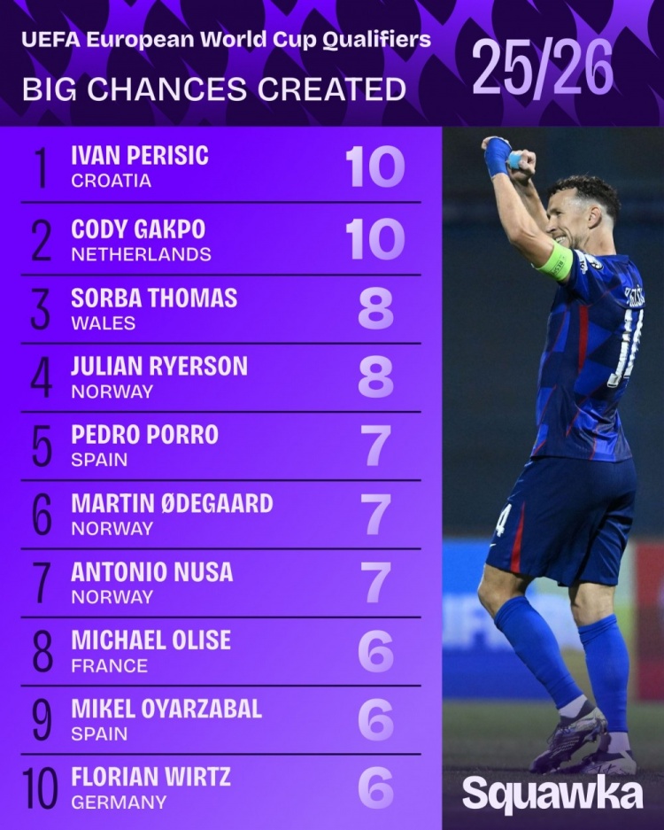 11月20日讯 本届世欧预小组赛一经告一段落,squakwa也统计了本届赛事创造要紧契机情况,佩里西奇和加克波比肩居首。