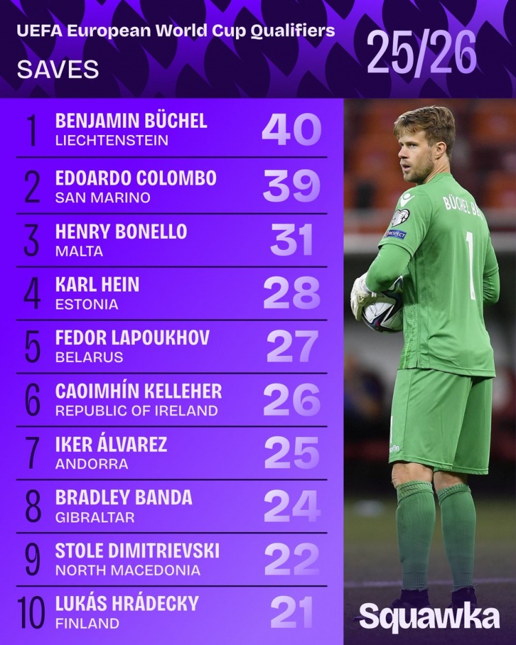 11月20日讯 Squawka统计世欧预各队门将扑救次数,列支敦士登门将本杰明·布歇尔40次居首。