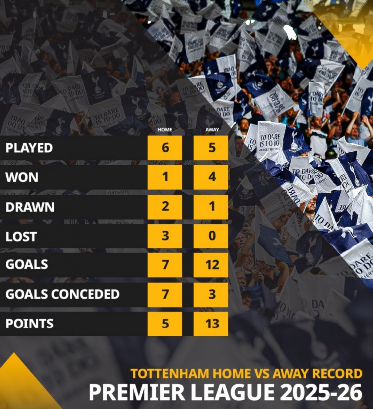 枪手留心!热刺本赛季客场拿到13分英超最多,主场只拿5分