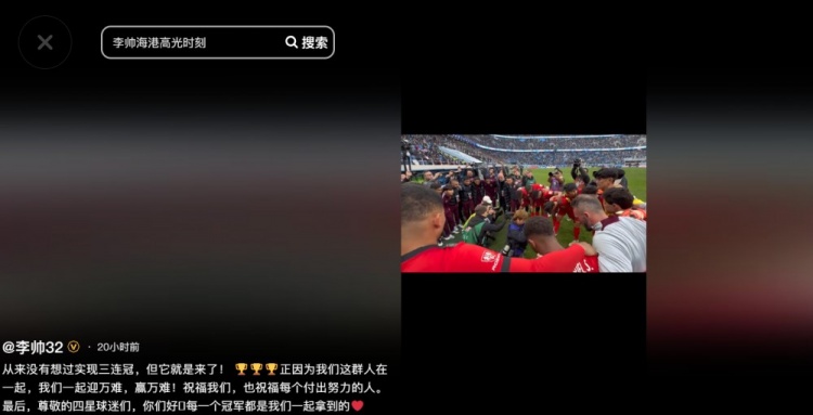 李帅发文:尊敬的四星球迷们,每一个冠军王人是咱们一谈拿到的