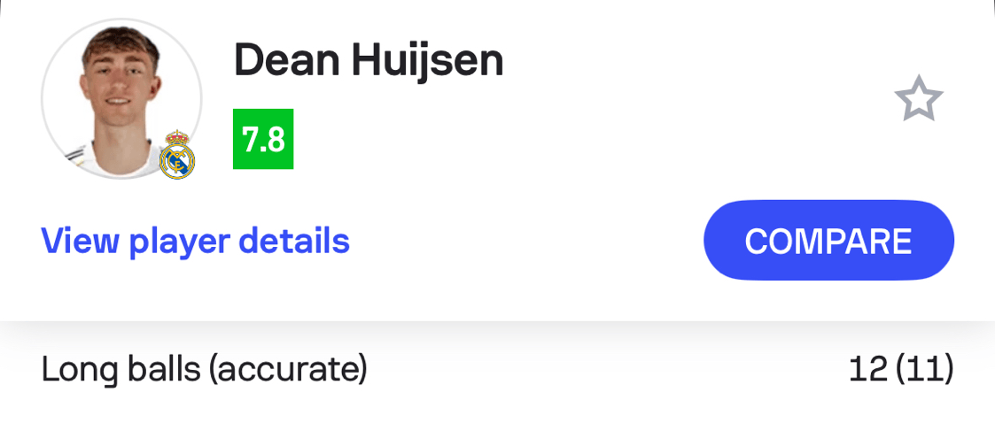 字据Sofascore的统计,怀森在本场比赛的上半场共进行12次长传,11次收效。在本赛季西甲、英超和法甲联赛首轮中出场的820名非门将球员中,莫得东说念主比怀森完成的长传收效次数更多。况兼他在对阵奥萨苏纳的比赛中,只是是在上半场就完成了这少量。