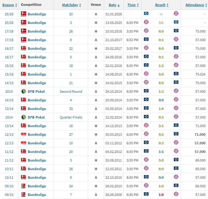 汉堡时隔7年再次对阵拜仁,效能5球惨败。汉堡各赛事对拜仁已9连败、20场不堪,且包含多场惨败,两次0-8、1次2-9、4次0-5、2次0-6,总比分7-76。