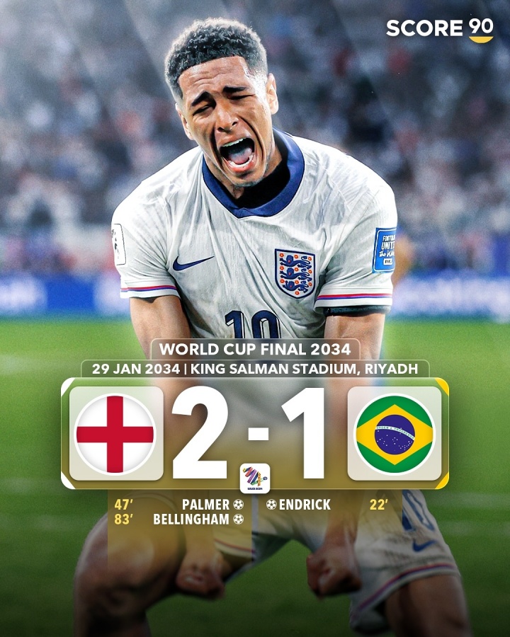 英格兰2-1逆转巴西,恩德里克最初破门,帕尔默扳平比分,贝林厄姆破门完成逆转。