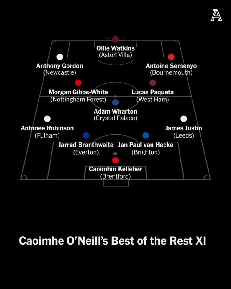 Caoimhe O’Neill:凯莱赫(布伦特福德);布兰斯维特(埃弗顿)、范赫克(布莱顿)、安东尼-罗宾逊(富勒姆)、贾斯汀(利兹);亚当-沃顿(水晶宫)、帕奎塔(西汉姆)、怀特(丛林);戈登(纽卡)、塞梅尼奥(伯恩茅斯)、沃特金斯(维拉)。