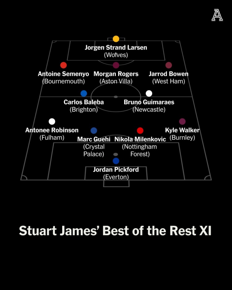 Stuart James: 皮克福德(埃弗顿);格伊(水晶宫)、米伦科维奇(丛林)、安东尼-罗宾逊(富勒姆)、沃克(伯恩利);吉马良斯(纽卡)、巴莱巴(布莱顿)、塞梅尼奥(伯恩茅斯)、罗杰斯(维拉)、鲍文(西汉姆);拉尔森(狼队)。