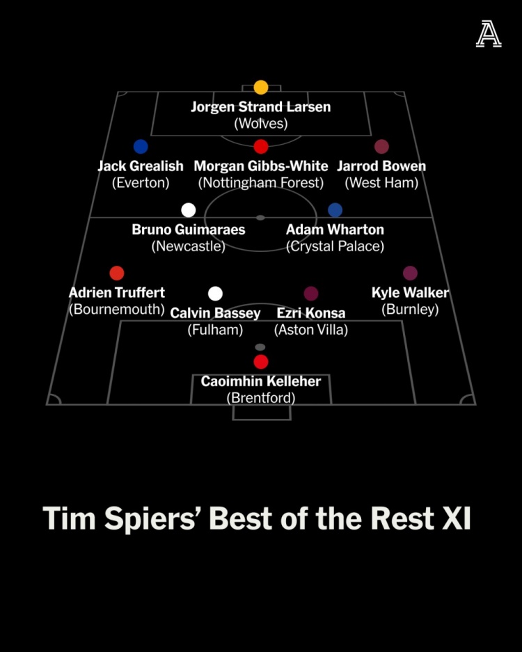 Tim Spiers:凯莱赫(布伦特福德);巴锡(富勒姆)、孔萨(维拉)、特吕费尔(伯恩茅斯)、沃克(伯恩利);吉马良斯(纽卡)、亚当-沃顿(水晶宫)、格拉利什(埃弗顿)、怀特(丛林)、鲍文(西汉姆);拉尔森(狼队)。