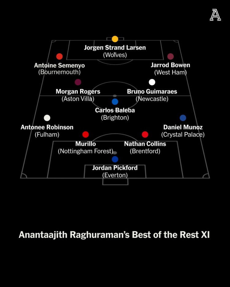 Anantaajith Raghuraman:皮克福德(埃弗顿);穆里略(丛林)、科林斯(布伦特福德)、安东尼-罗宾逊(富勒姆)、穆尼奥斯(水晶宫);吉马良斯(纽卡)、巴莱巴(布莱顿)、罗杰斯(维拉);塞梅尼奥(伯恩茅斯)、鲍文(西汉姆)、拉尔森(狼队)。