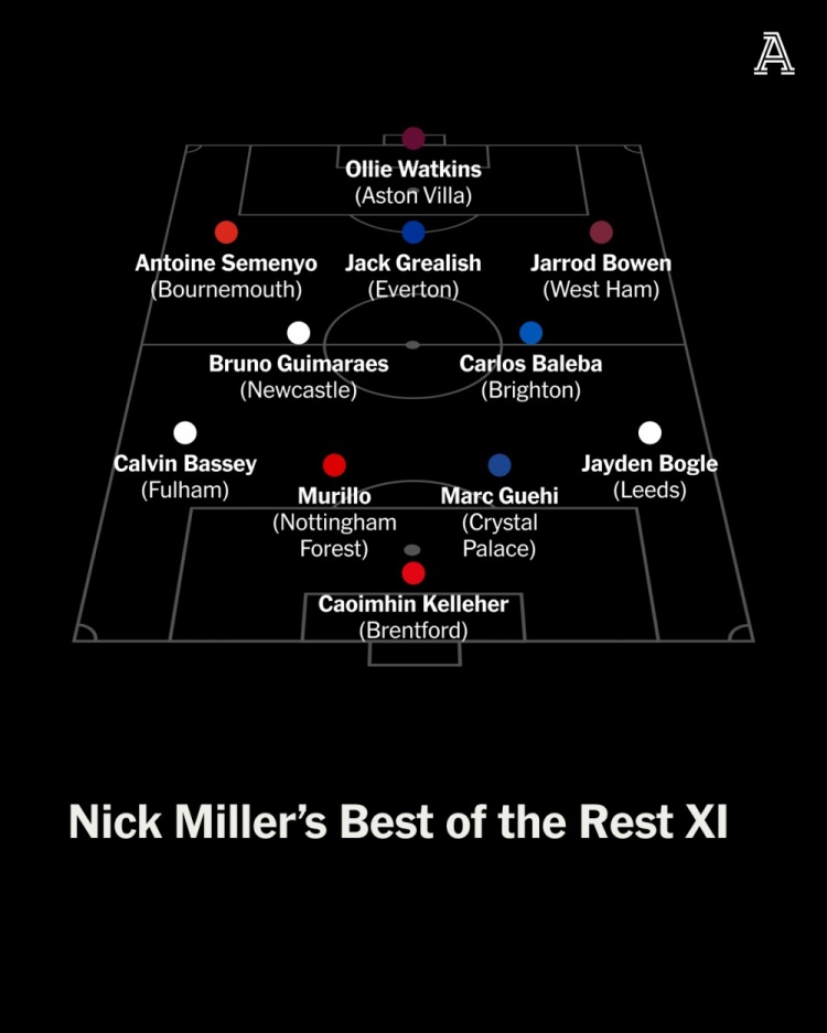 Nick Miller:凯莱赫(布伦特福德);格伊(水晶宫)、穆里略(丛林)、巴锡(富勒姆)、杰登-博格(利兹);吉马良斯(纽卡)、巴莱巴(布莱顿)、塞梅尼奥(伯恩茅斯)、格拉利什(埃弗顿)、鲍文(西汉姆);沃特金斯(维拉)。