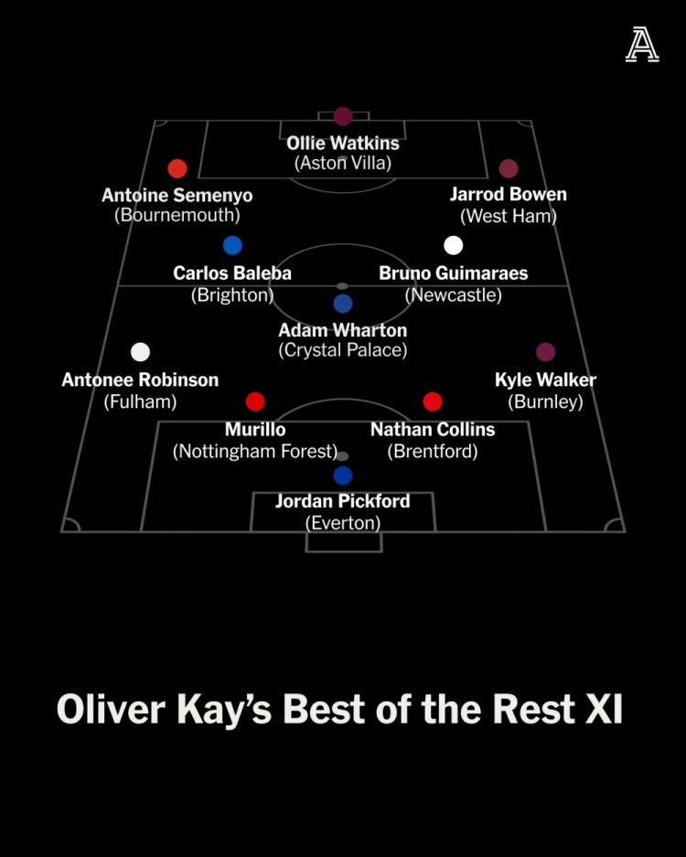 Oliver Kay:皮克福德(埃弗顿);穆里略(丛林)、科林斯(布伦特福德)、安东尼-罗宾逊(富勒姆)、沃克(伯恩利);亚当-沃顿(水晶宫)、吉马良斯(纽卡)、巴莱巴(布莱顿);塞梅尼奥(伯恩茅斯)、鲍文(西汉姆)、沃特金斯(维拉)。